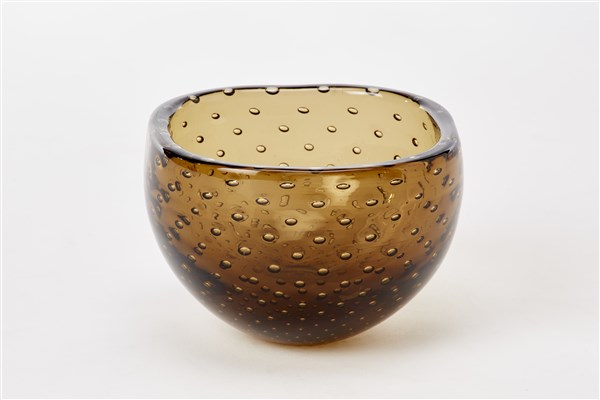 Piccola bomboniera in vetro sommerso ambrato con inclusione di bolle disposte regolarmente. Murano, anni '40/'50. Firmata all'acido "venini murano MADE IN ITALY". (h cm 10; d cm 14)