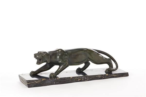 J. Brault "Pantera" Scultura Art Déco in bronzo con base in marmo nero. Francia,
