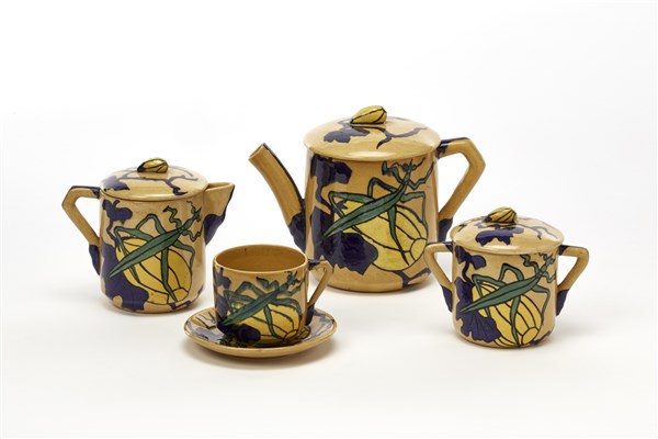 Tea set made up of six saucers with cups, milk jug, sugar bowl, teapot. Albisola Capo, 1930s/1940s.