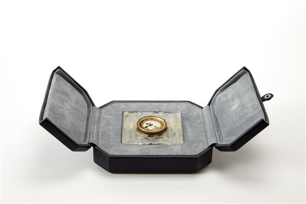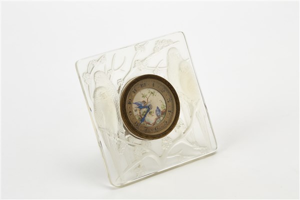 Orologio da tavolo modello "Inséparables". Manifattura Lalique, Francia, anni '30. Cornice in vetro opalescente soffiato in stampo, molato e patinato. Quadrante dell'orologio dipinto a mano, cassa in ottone iscritta al verso, movimento di fabbricazione svizzera. In scatola non coeva rivestita in pelle. Firmato a rilievo in stampo e a punta "R. LALIQUE France". (cm 11x11) (difetti)