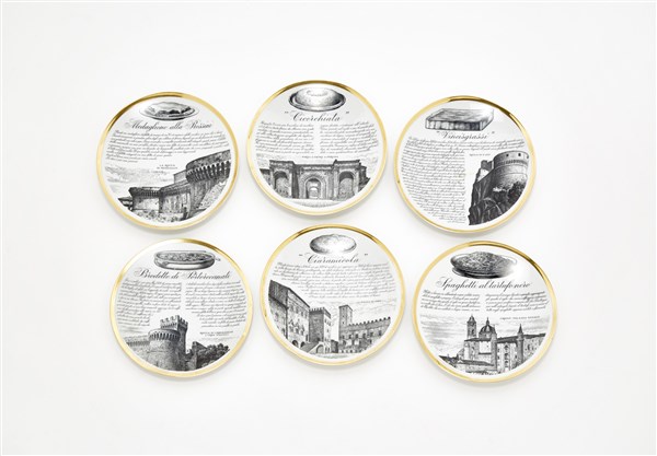 Piero Fornasetti Sei piatti della serie "Specialità umbro-marchigiane". Milano,