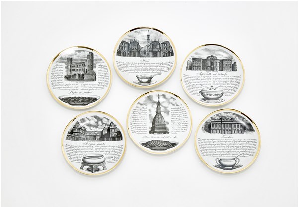 Piero Fornasetti Sei piatti della serie "Specialità torinesi". Milano, anni '60/