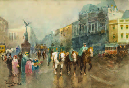 Paolo Sala Milano 1859 – 1924 SCORCIO CITTADINO tempera e acquerello su carta, cm 34x49. Firmato in basso a sinistra: Paolo Sala