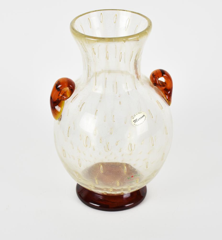 VASO BIANSATO IN VETRO DI MURANO con inclusioni in foglia d'oro e anse a...