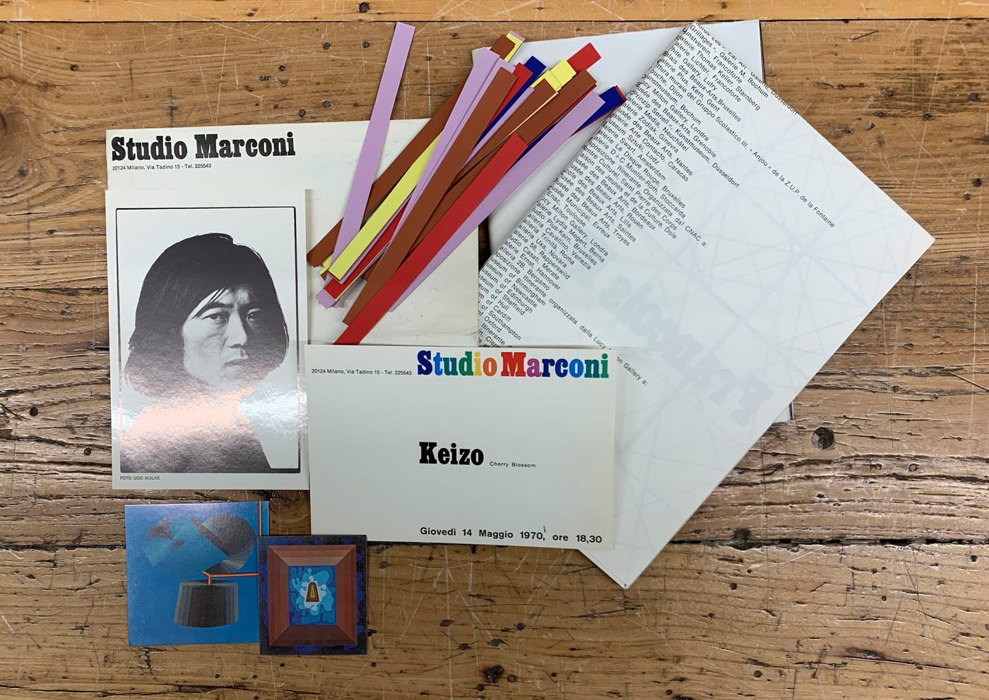 Una busta contenente un ritratto fotografico dell'Artista realizzato da Ugo Mulas, un cartoncino di invito dello Studio Marconi, due riproduzioni di opere e numerosi cartoncini colorati