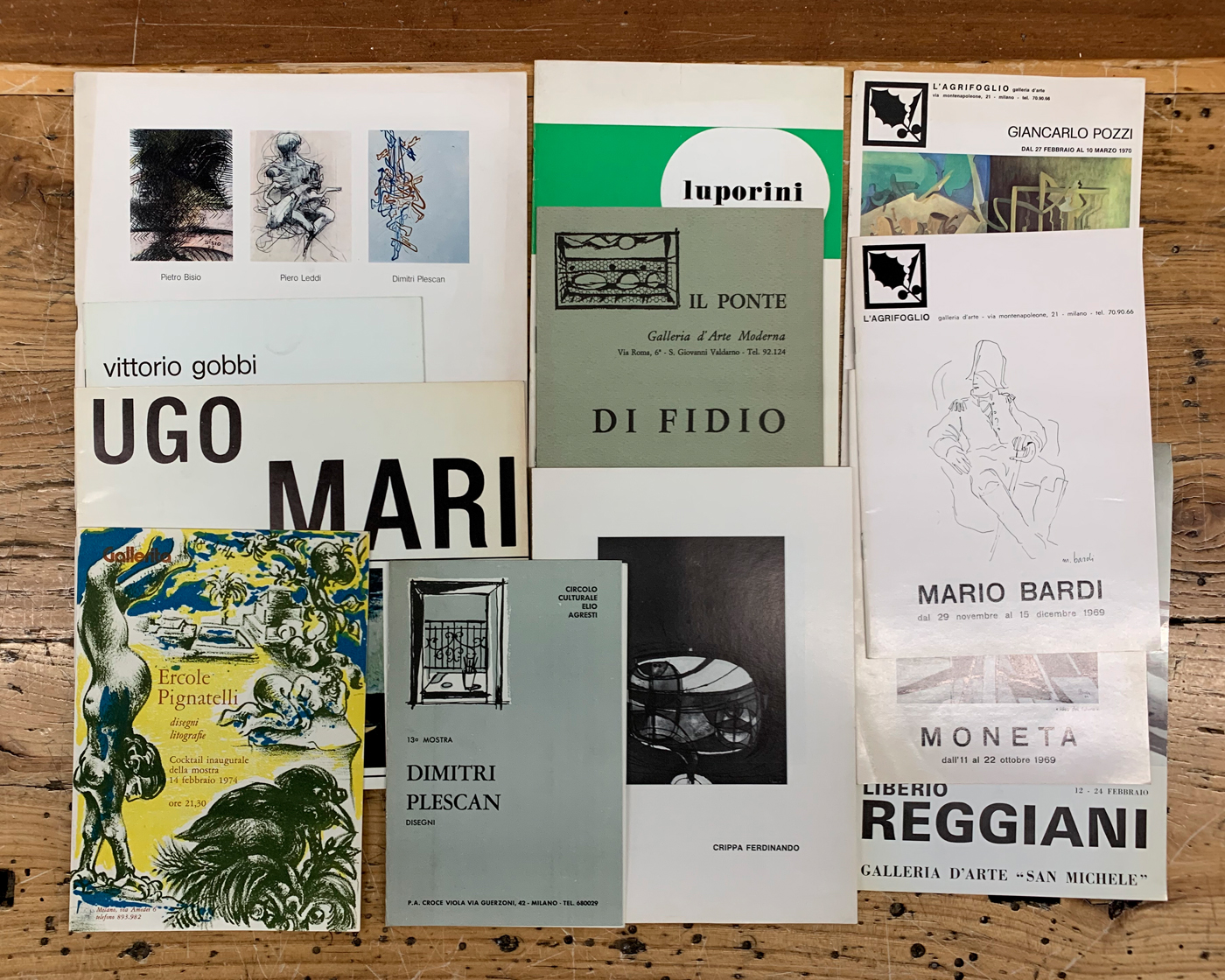 Lotto unico di numerosi cataloghi, pieghevoli e brochure relativi a storiche esposizioni dei seguenti artisti: Giuseppe Martinelli, Dimitri Plescan, Guido Di Fidio, Spinoccia, Vittorio Gobbi, Giovanni Alicò, Ercole Pignatelli, Giuseppe Giannini, Luciana Manelli, Giordano Pavan, Ugo Mari, Togo, Ferdinando Crippa, Gianni Arde, rinaldo pigola, Ferdinando Moneta, Giancarlo Pozzi, Liberio Reggiani, Mario Bardi, Pietro Bisio e Sandro Luporini