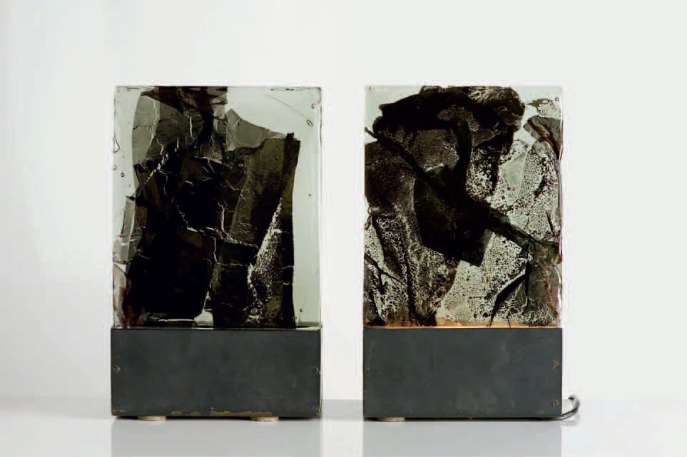 Gio Ponti – Toni Zuccheri COPPIA DI “VETRATE GROSSE”, 1964 circa Prodotte da Venini. Placche in vetro policromo, di grosso spessore, su montature metalliche originali, illuminate inferiormente. Opera registrata presso Gio Ponti Archives con il n. 06027/123; cm 35x20 Bibliografia: F. Deboni, I vetri Venini, Torino, 2007, vol. II, n.261