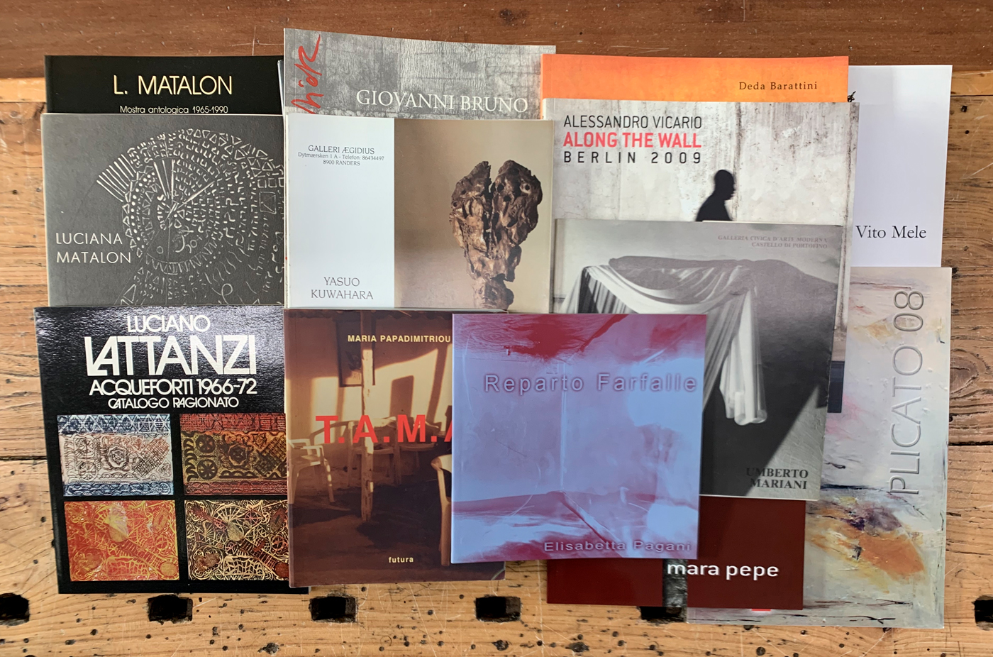 Lotto unico composto da 25 cataloghi riferiti ad esposizioni dei seguenti artisti: Luciano Lattanzi, Claudio Borghi, Giovanni Bruno, Luciana Matalon, Umberto Mariani, Giorgio Albertini, Ugo Mari, Yasuo Kuwahara, Deda Barattini, Minervino, Nino Longobardi, Dario Alvarez Basso, Valerio Anceschi, Maria Papadimitriou, Alessandro Vicario, Vito Mele, Cristiano Plicato, Elisabetta Pagani, Mara Pepe