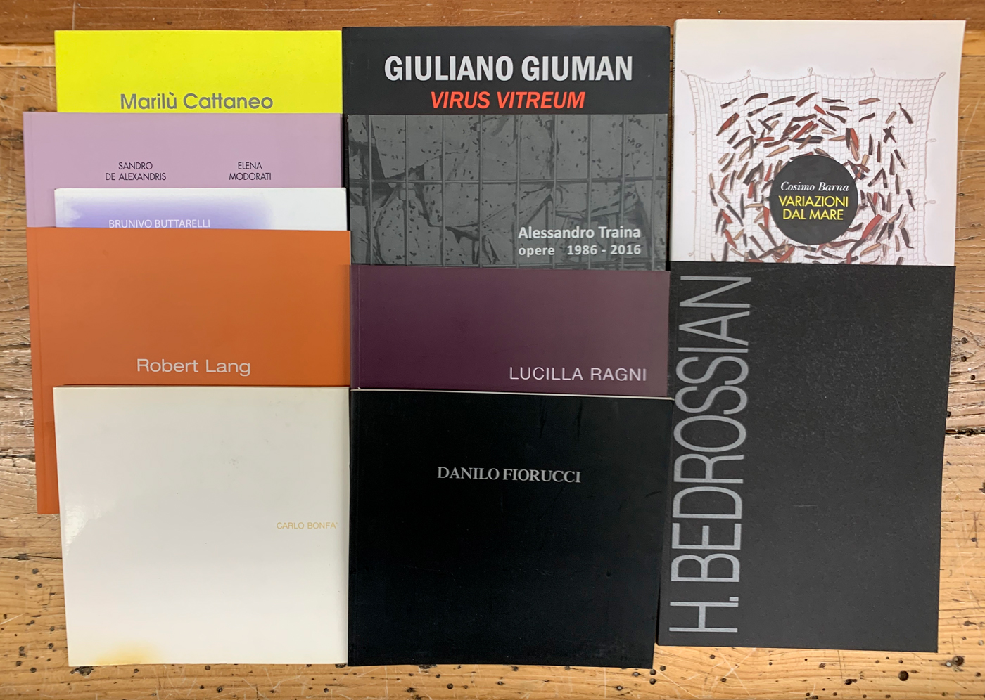 Lotto unico composto da 15 cataloghi riferiti ad esposizioni dei seguenti artisti: Carlo Bonfà, Filippo Maggiore, Sandro De Alexandris, Brunivo Buttarelli, Elena Modorati, Henrig Bedrossian, Marilù Cattaneo, Alessandro Traina, Giuliano Giuman, Cosimo Barna, Robert Lang, Lucilla Ragni, Rota Candiani, Santinello e Danilo Fiorucci