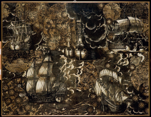 Piero Fornasetti PANNELLO “GALEONI”, primi anni ’60 tiratura limitata, serigrafia su legno predisposto; cm 101x131