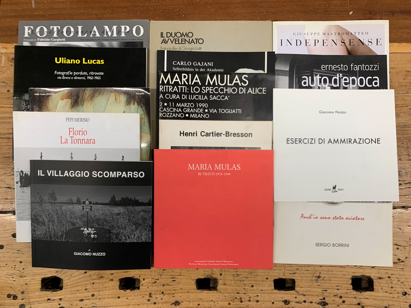 Lotto unico di 15 cataloghi riccamente illustrati relativi ai seguenti fotografi: Maria Mulas, Henri Cartier-Bresson, Giacomo Nuzzo, Pepi Merisio, Ernesto Fantozzi, Uliano Lucas, Antonio Amaduzzi, Giuseppe Mastromatteo, Fabrizio Garghetti, Giorgio Lotti, Sergio Borrini, Carlo Gajani e Giulio Cerere