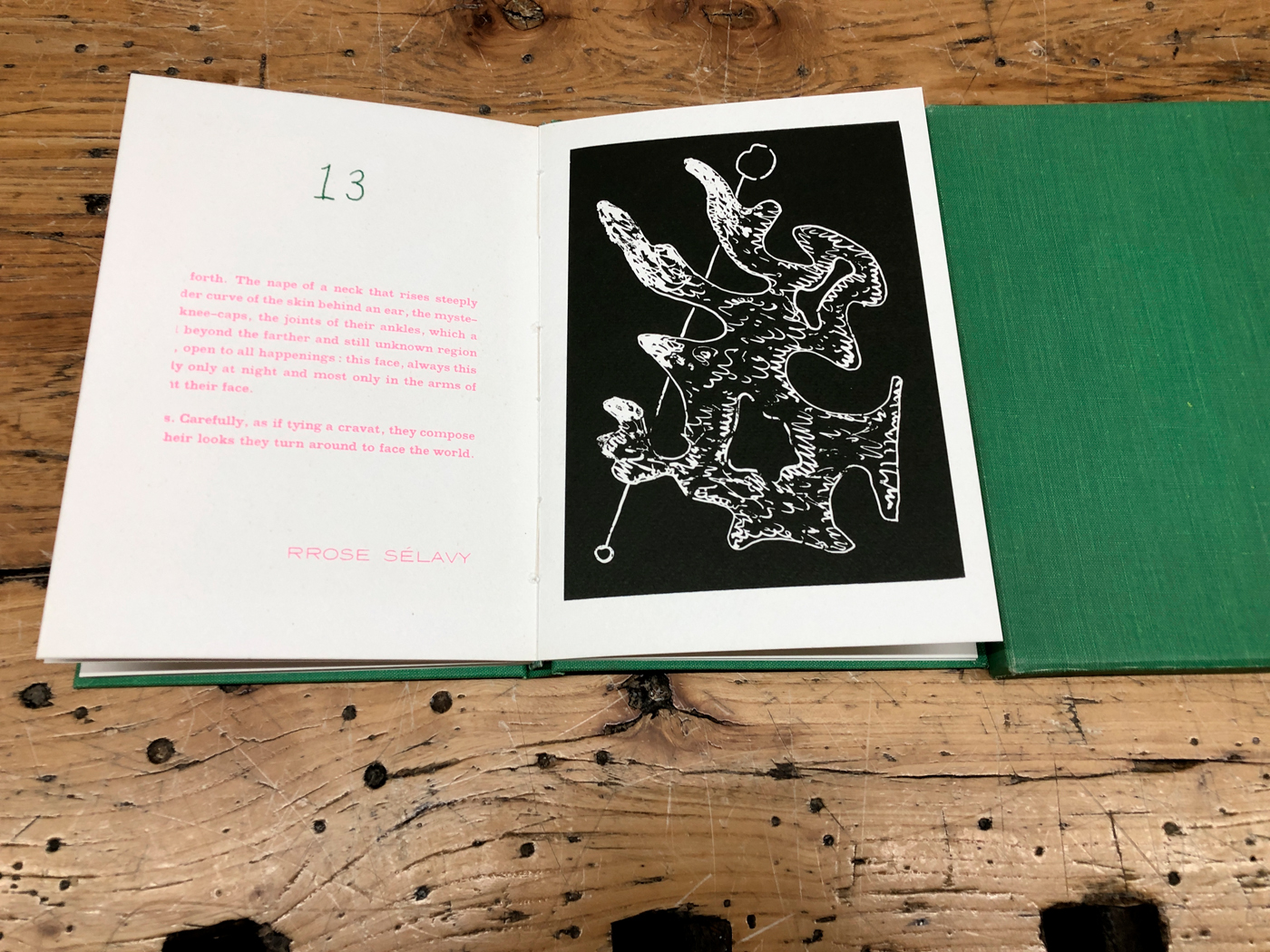 Catalogo con copertina con monogramma in argento su fondo verde, 13 riproduzioni di disegni dell'Artista e testi di André Breton (caratteri impressi in verde), Paul Eluard (caratteri impressi in nero) e "Rrose Sélavy" Marcel Duchamp (caratteri impressi in fucsia)