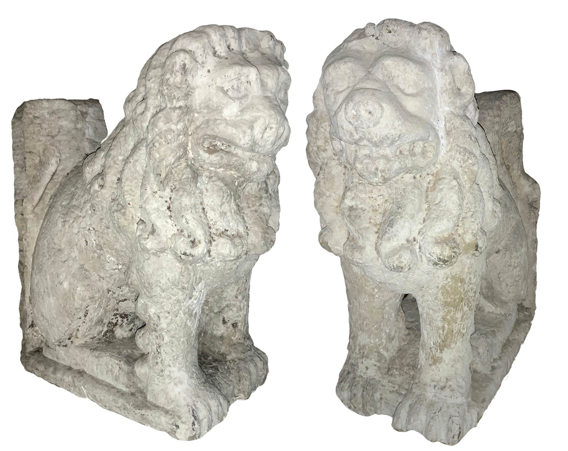 Coppia di leoni in pietra bianca, Sicilia, XII /XIII Secolo. H cm 75, lunghezza cm 63, larghezza cm 32. Provenienza della famiglia Paternò Castello di Biscari.