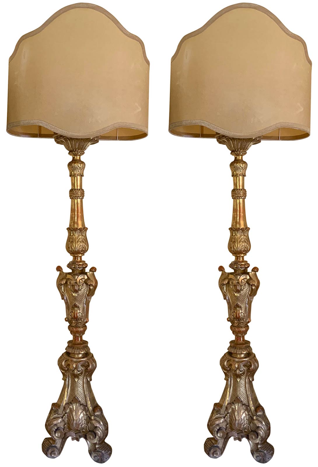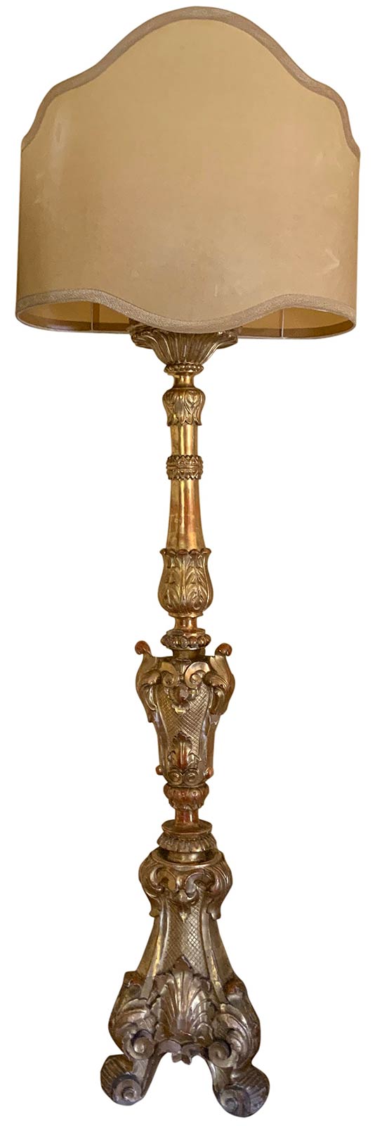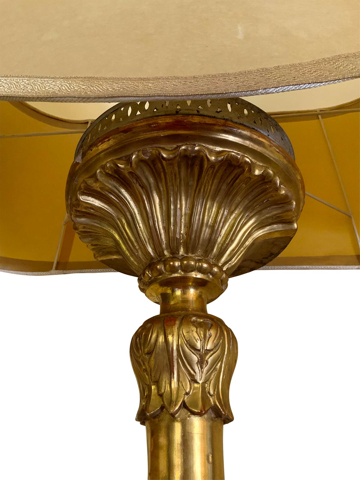 Coppia di candelieri in legno dorato a foglia, Sicilia, fine XVIII secolo. H cm 150, esclusa la ventola. Provenienza della famiglia Paternò Castello di Biscari.