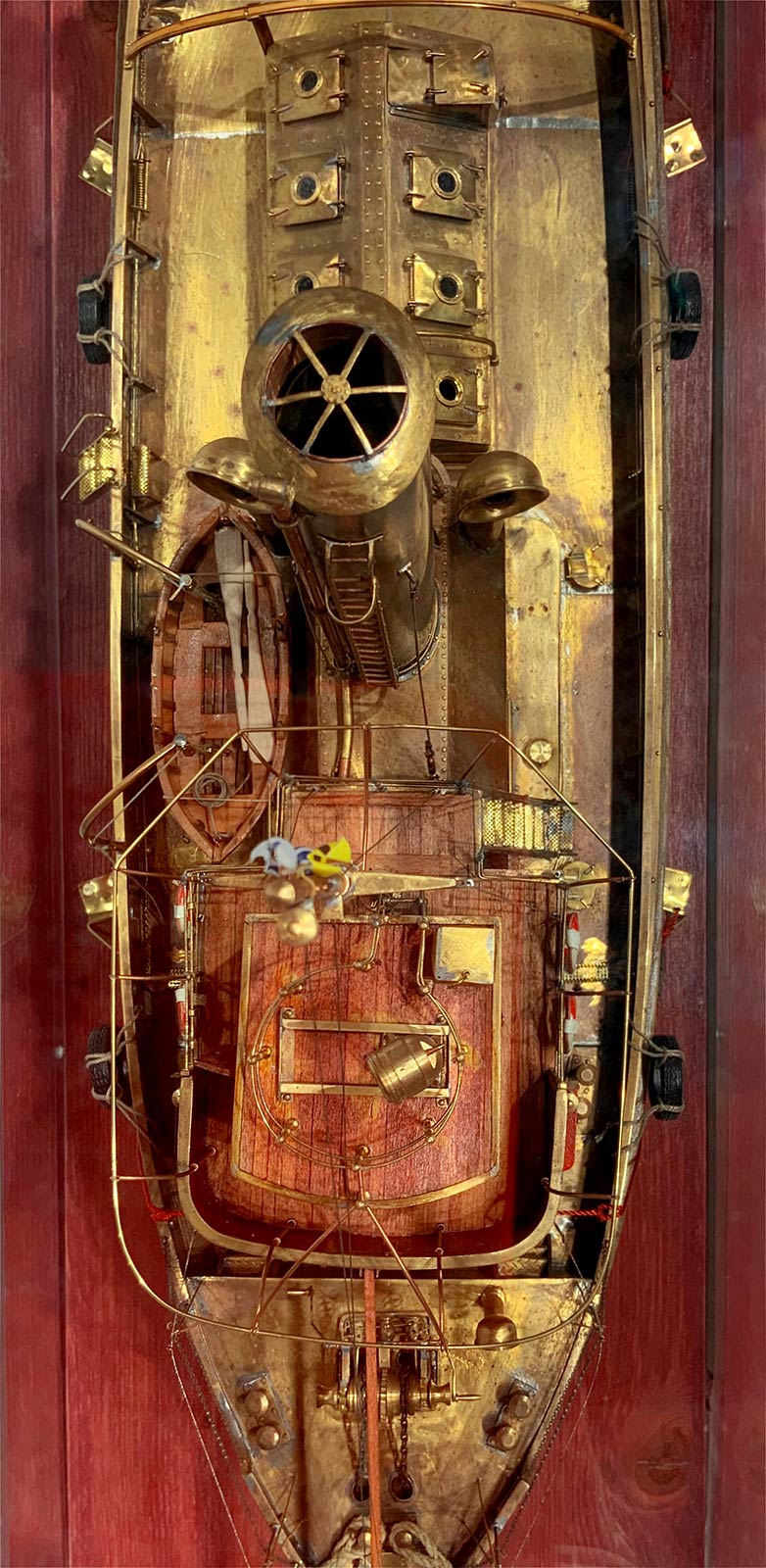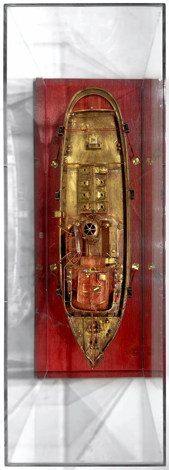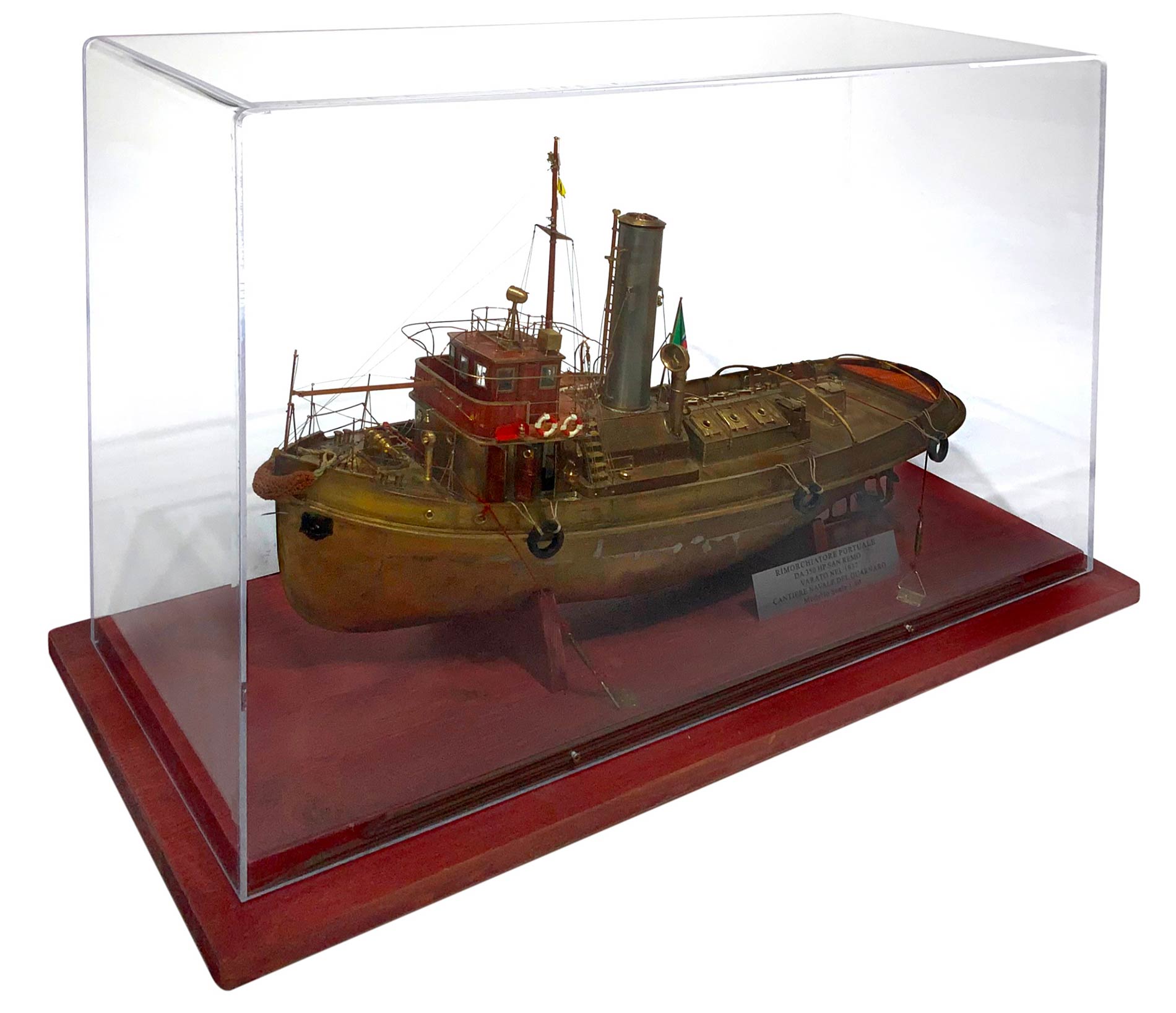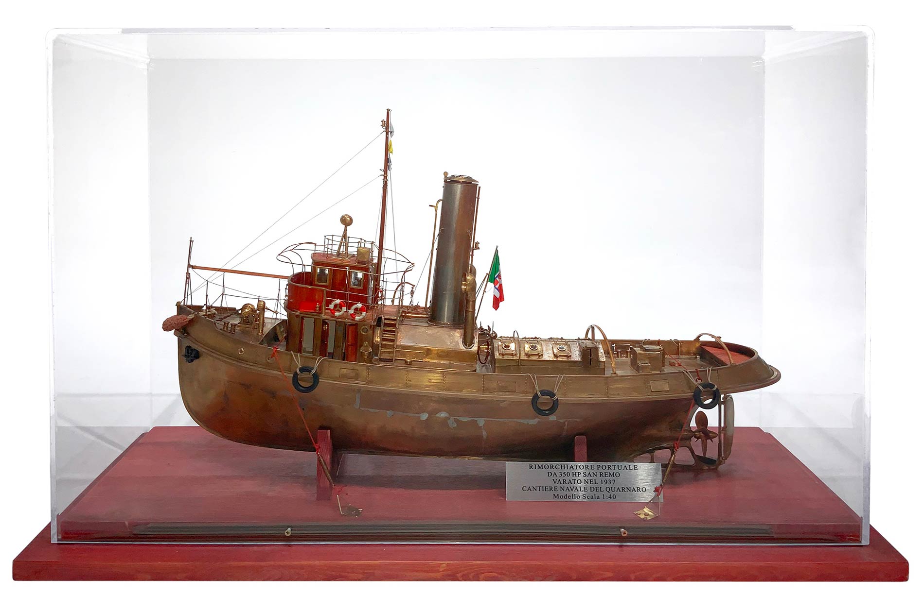 San-Remo. Rimorchiatore 350 HP Misure scala 1:40 H Mm 360; Lunghezza Mm 620; Larghezza Mm 150. In ottone, listelli in legno e lamiere zincate. Misure del modello originale: H M-14,40; Lunghezza M-24,90; Larghezza M- 6. Partecipazione certificata al campionato d’Italia della federazione italiana Navimodel. Classificandosi nella Classe C2 nel rango argento, con qualificazione ai mondiali che avverranno nel 2020 a Fiume in Croazia. Tale opera è stata creata su disegni originali della marina militare italiana. Unico esemplare.