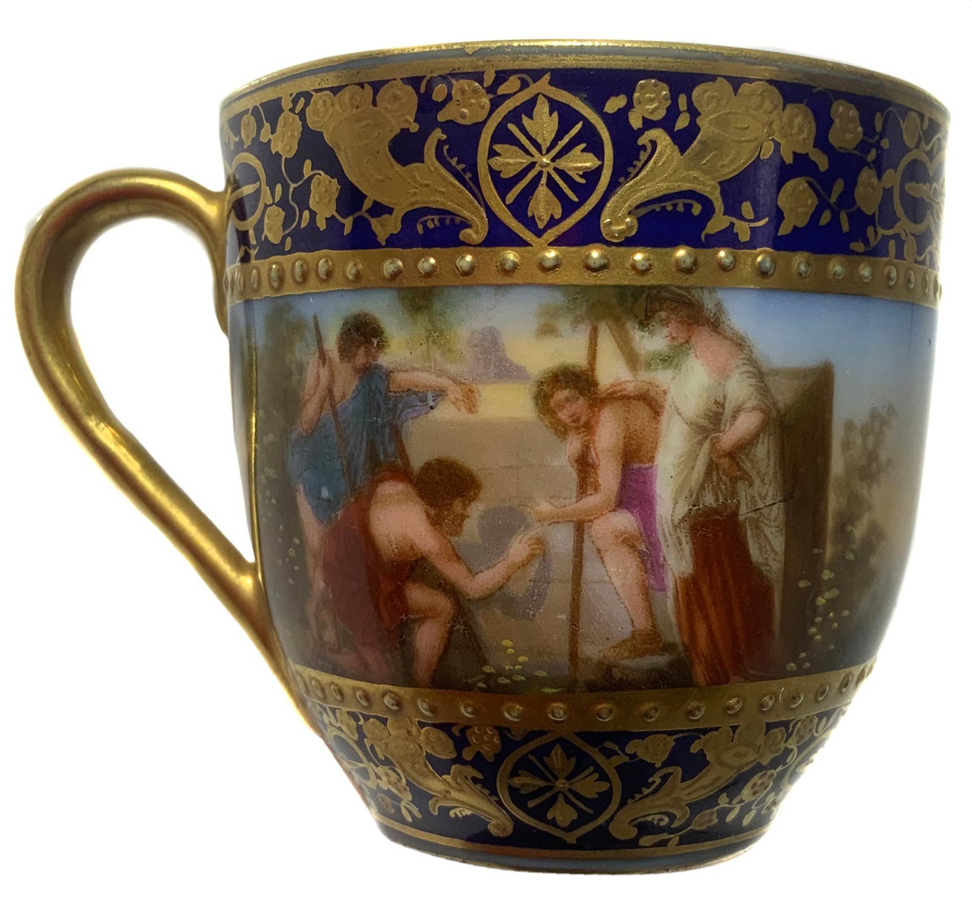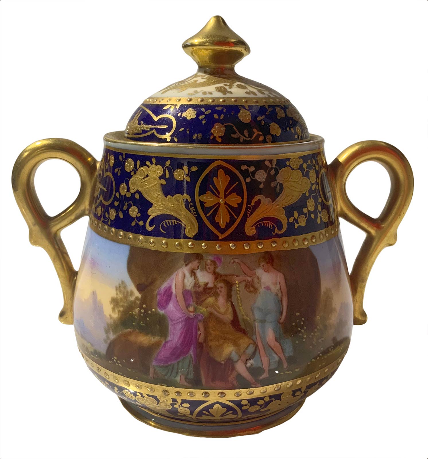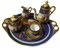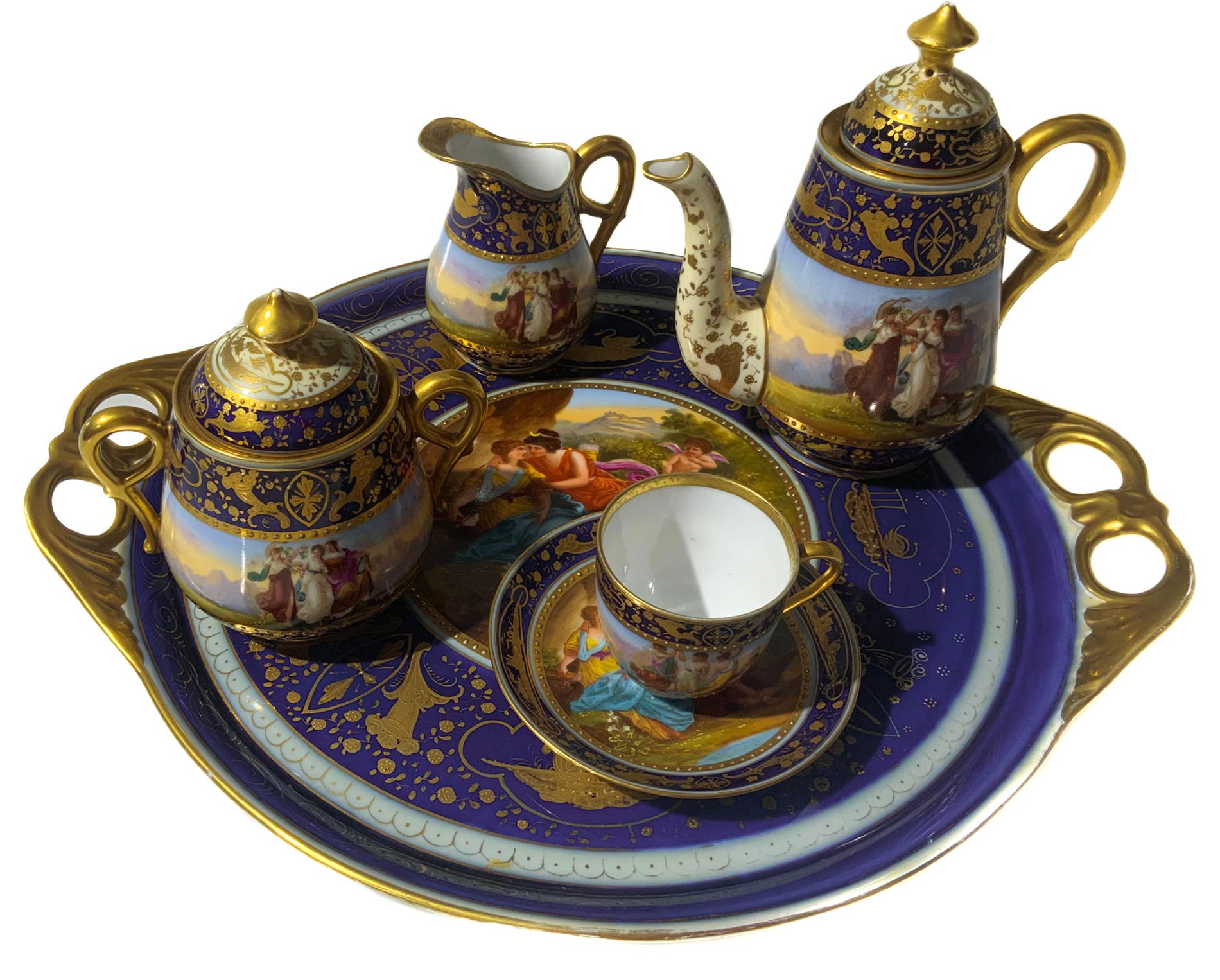 Servizio da tè in porcellana di Vienna, colore blu cobalto con dipinti raffiguranti scene di genere, fine XIX Secolo. Composto da vassoio, 1 caffettiera, 1 lattiera, 1 zuccheriera, 1 tazzina con piattino.