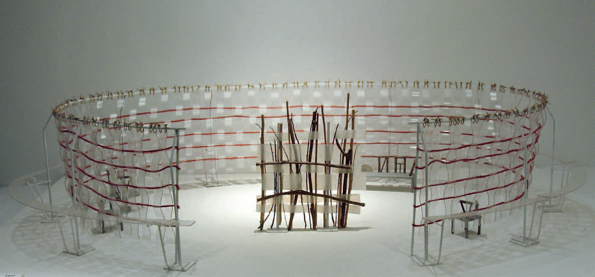 Andrea Branzi MAQUETTE DI “ELLISSE”, 2008 Progetto per l’istallazione presso la Fondation Cartier, Parigi. Plexiglass, corda e legno; in teca; misure complessive: cm 44x150x94 La maquette rappresenta una delle due istallazioni per la mostra Open Enclosures che si tenne dal 28 Marzo al 22 Giugno del 2008 alla Fondation Cartier pour l’art contemporain a Parigi. Le istallazioni furono realizzate in vetro, metallo, corda ed elementi naturali come rami e fiori con l’ambientazione musicale di Patti Smith.