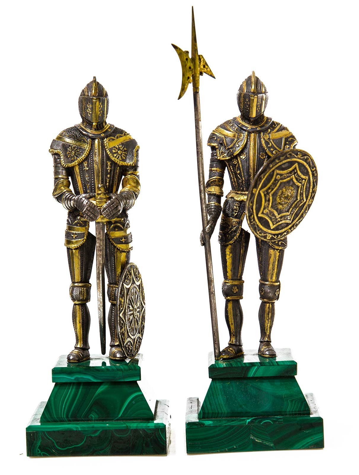 2 miniature in argento vermeil. Guerrieri con armatura. Base in malachite. H cm 14