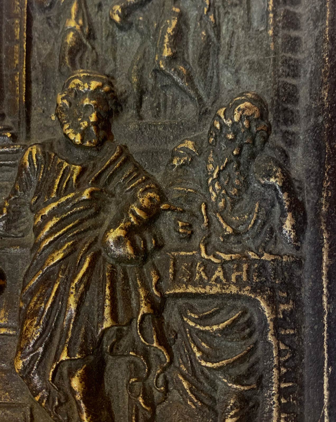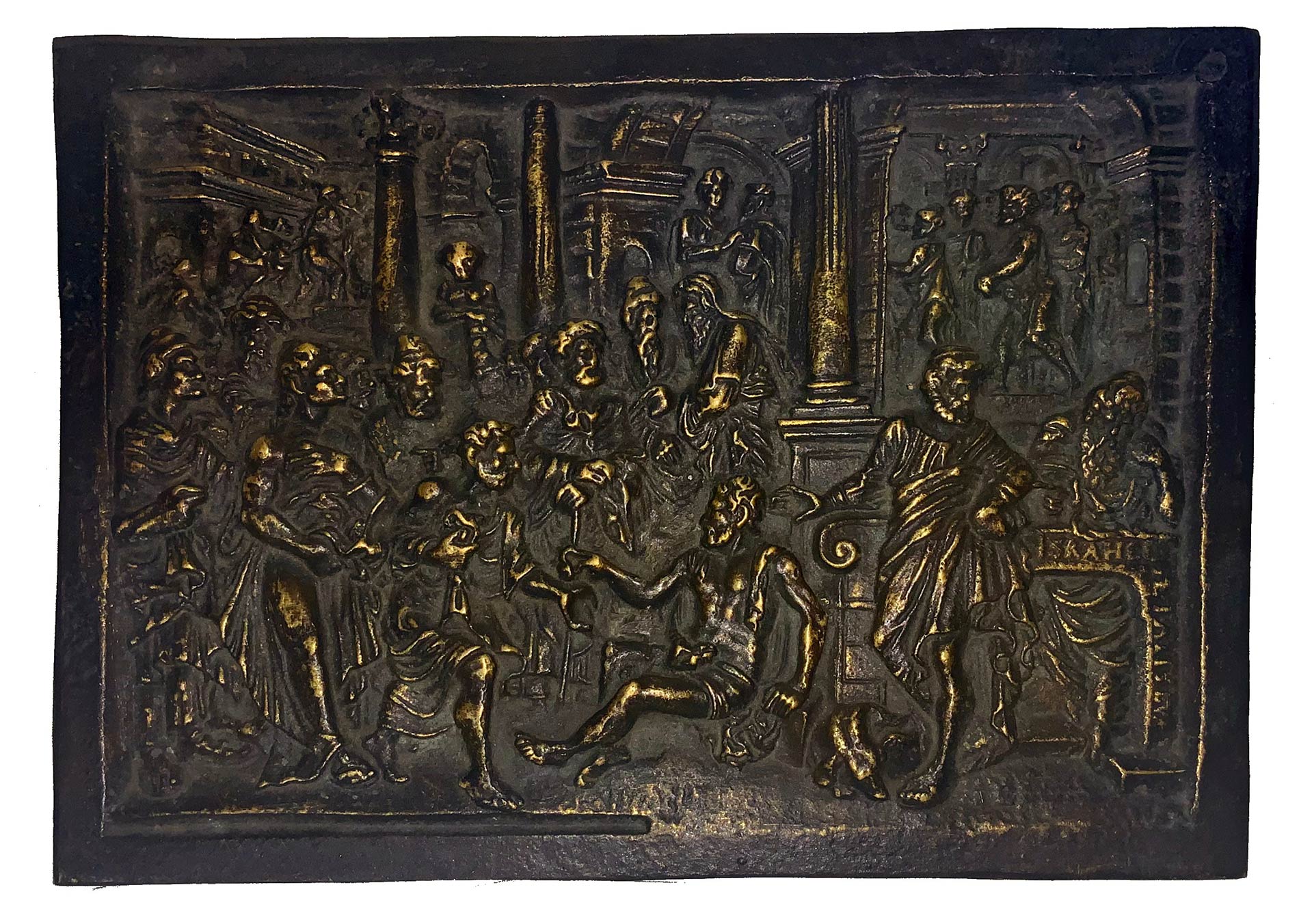 Attribuito a Galeazzo Mondella, detto "Il Moderno" (Verona 1467-1528). Placcheta in bronzo raffigurante scena biblica riportante scritta "Israel retatis Evae". H cm 16x22