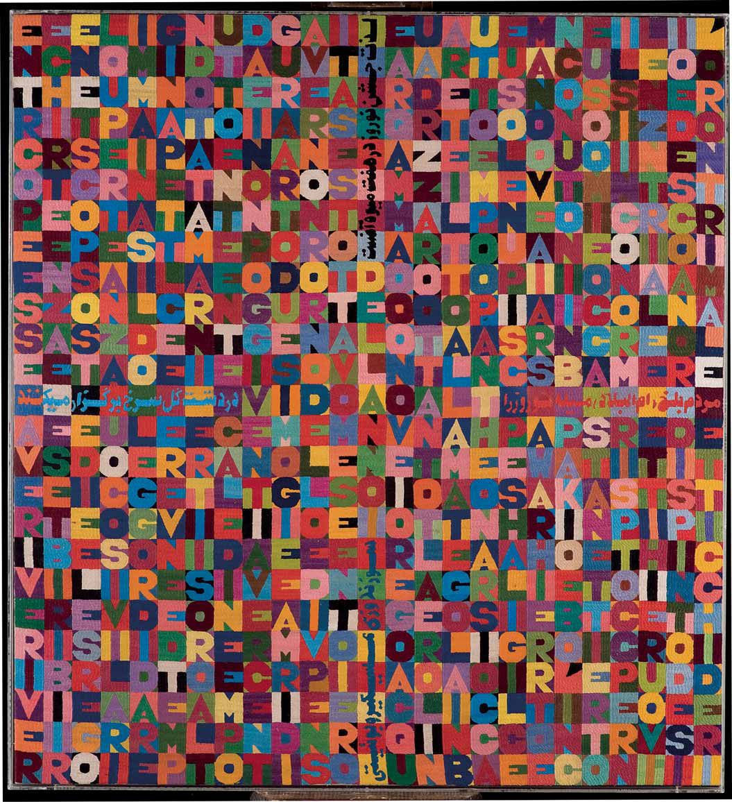 Alighiero Boetti Torino 1940 – Roma 1994 SENZA TITOLO, 1988 ricamo, cm 104x113. Firmato e datato al verso: Alighiero e Boetti 1988, Peshawar – Pakistan. Esposizioni: Genazzano, Castello Colonna di Genazzano. Polo Museale Internazionale per l’Arte Contemporanea, Cross-roads. Incroci, 31 marzo-24 giugno 2001. Bibliografia: Alighiero Boetti, catalogo della mostra, Ronchini Arte Contemporanea, Terni 1996; Cross-roads. Incroci, catalogo della mostra, a cura di A. Boatto, G. Mercurio, Campisano Editore, Roma 2001, n. 171, p. 184 riprodotto.