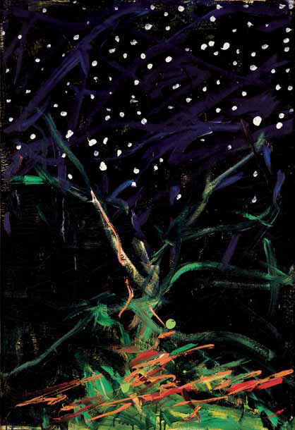 Mario Schifano Homs 1934 – Roma 1998 NOTTETEMPO, 1986 smalto e acrilico su tela, cm 130x90. Firmato, datato e titolato al verso: Schifano 86, Nottempo. Bibliografia: Mario Schifano. Opere su tela 1956-1982, Studio metodologico riguardante la catalogazione informatica dei dati relativi alle opere di Mario Schifano presenti presso la Fondazione M. S. Multistudio, Università degli studi, Facoltà di lettere e filosofia, Dipartimento di scienze dell’antichità, del Medioevo e geografico-ambientali (DISAM), Genova 2007, vol. A) II°, n. 86/079, p. 155 riprodotto. Opera archiviata presso la Fondazione Mario Schifano con il numero 86/079