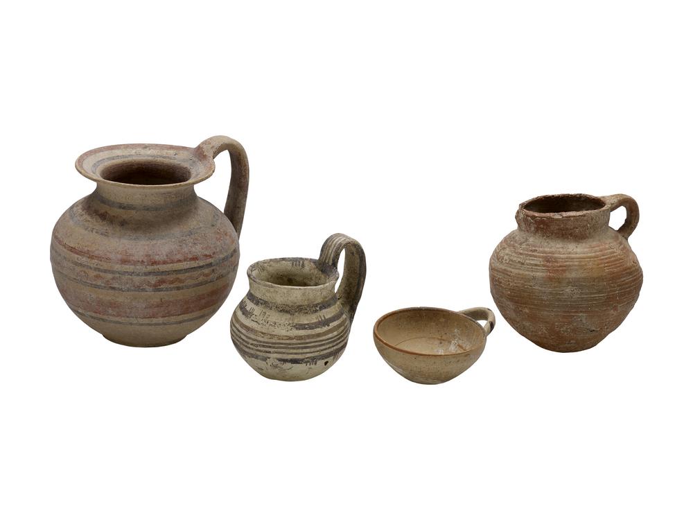Due brocchette una con orlo dritto e l'altra estroflesso, entrambe con corpo globulare schiacciato ed ansa a nastro sormontante, decorate a fasce alternate in bruno e paonazzo; una brocchetta acroma con corpo globulare ed orlo a colletto ed una coppetta monoansata decorata a fasce (4)