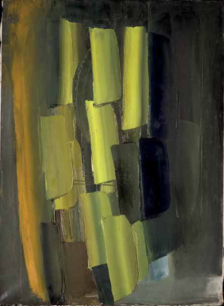 Alfredo Chighine Milano 1914 – Pisa 1974 COMPOSIZIONE NERO E GIALLO, 1960 olio su tela, cm 100x73. Titolato, datato e firmato al verso: 10-1960, Composizione nero e giallo,Chighine. Provenienza: Milano, Galleria del Milione (etichetta e timbro al verso).