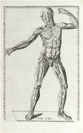 Prima edizione della raccolta di tavole anatomiche disegnate da Eustachi nel Cinquecento e pubblicate postume per la prima volta a cura del Lancisi nel 1714. Eustachi, medico del Cardinale Giulio della Rovere, è conosciuto per avere sempre derivato le sue teorie anatomiche dallo studio concreto delle autopsie e l'innovativa opera venne più volte pubblicata fino al XVIII secolo.