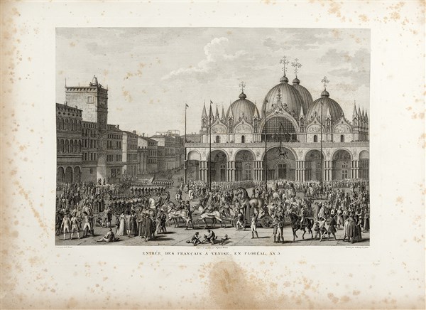 Edizione illustrata di grande formato dedicata alle campagne napoleoniche d'Italia e Germania, e corredata da splendide tavole incise. Contiene, in fine: Ceremonies du sacre et du couronnement da sa Majeste Imperiale Napoleon-Le-Grand e Precis historique de la Campagne d'Allemagne.
