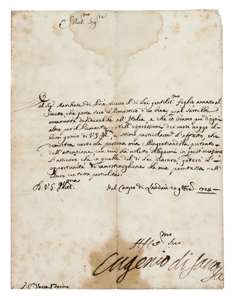Lettera firmata del celebre condottiero di risposta al Conte Vacca in cui lo ringrazia per un sonetto e un messaggio di buon auspicio ".. che porta seco il pronostico d'un bene qual sarebbe veramente desiderabile all'Italia e che io bramo più d'ogni altro per il Piemonte". La lettera venne scritta dal campo imperiale di Landau durante il terzo assedio della città che si concluse con la sconfitta francese.