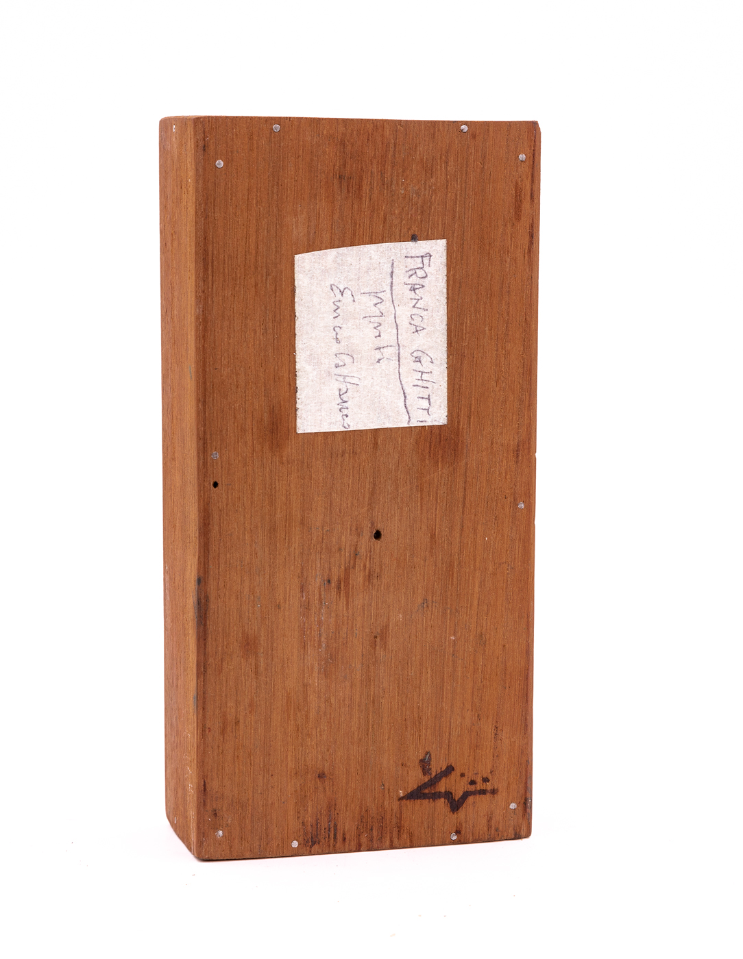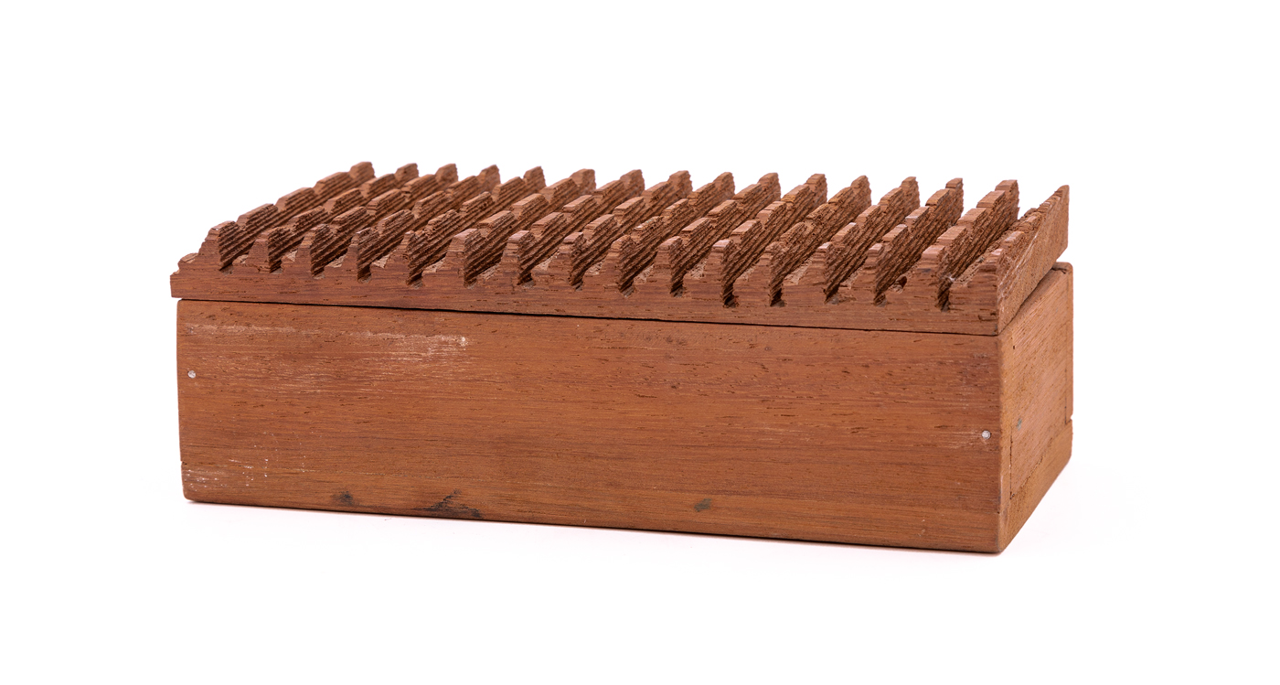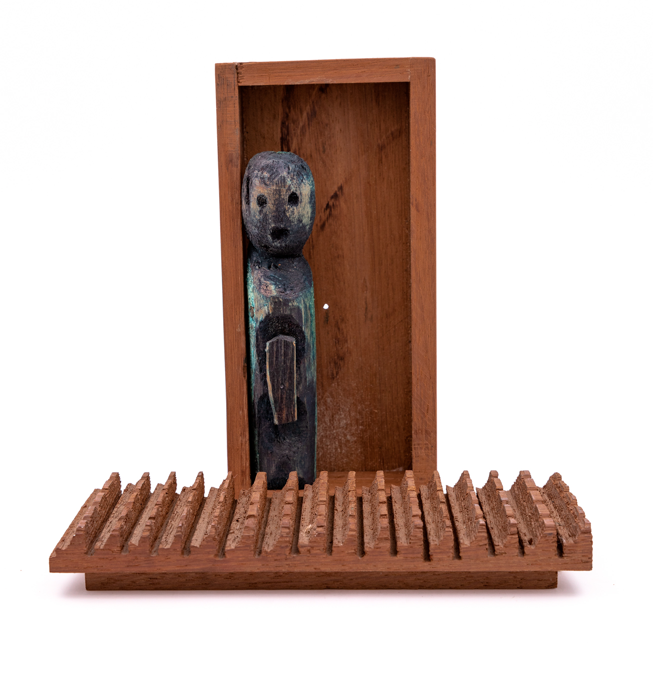 Scatola in legno con coperchio sagomato contenente statuina in legno dipinto