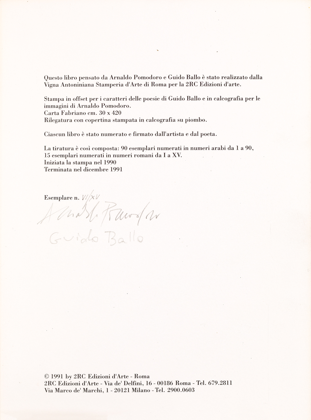Firme di Arnaldo Pomodoro e Guido Ballo e numerazione (Esemplare VI/XV) sulla quarta di copertina a matita