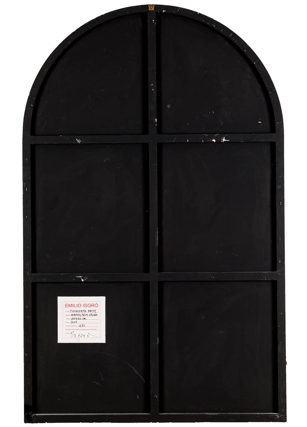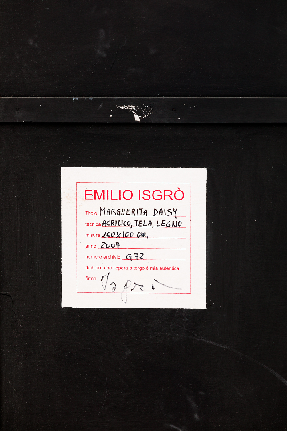 Etichetta dell'Artista al retro con firma per autenticità, titolo, tecnica, misure, datazione e numero di archiviazione