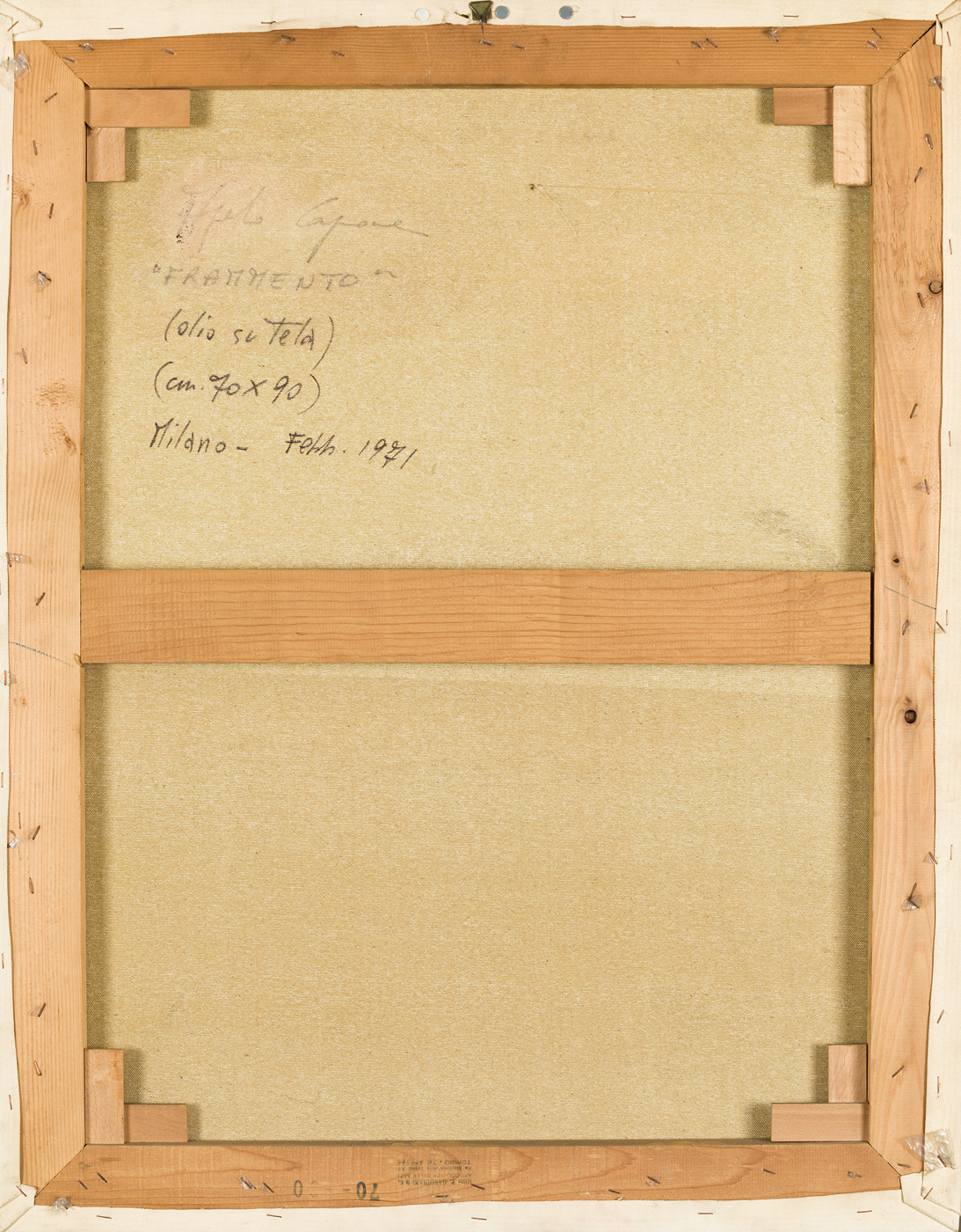 Firma, titolo, tecnica, misure, località (Milano) e datazione (Febbr. 1971) al retro