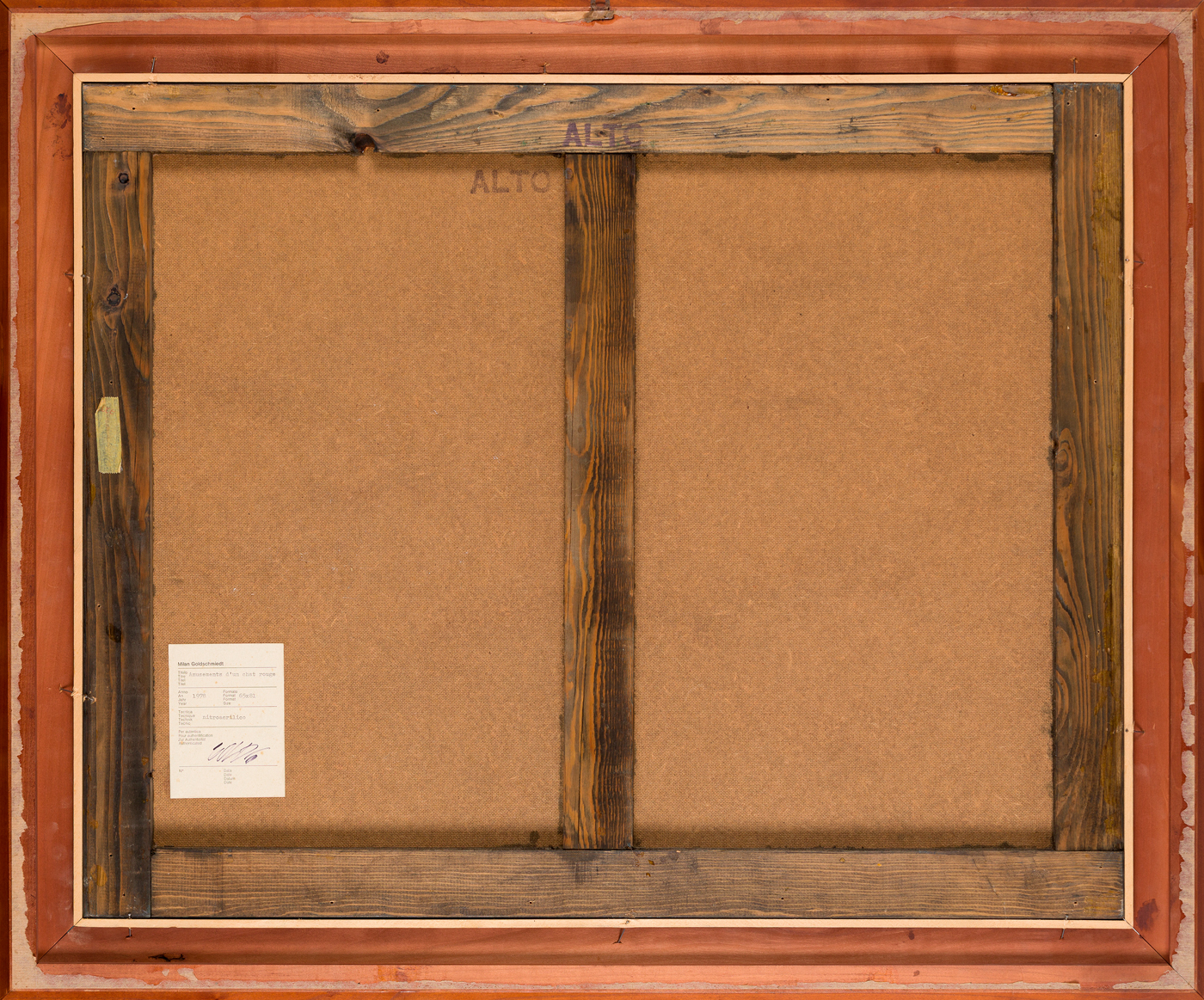 Etichetta dell'Artista al retro con firma, titolo, tecnica, misure e datazione al retro