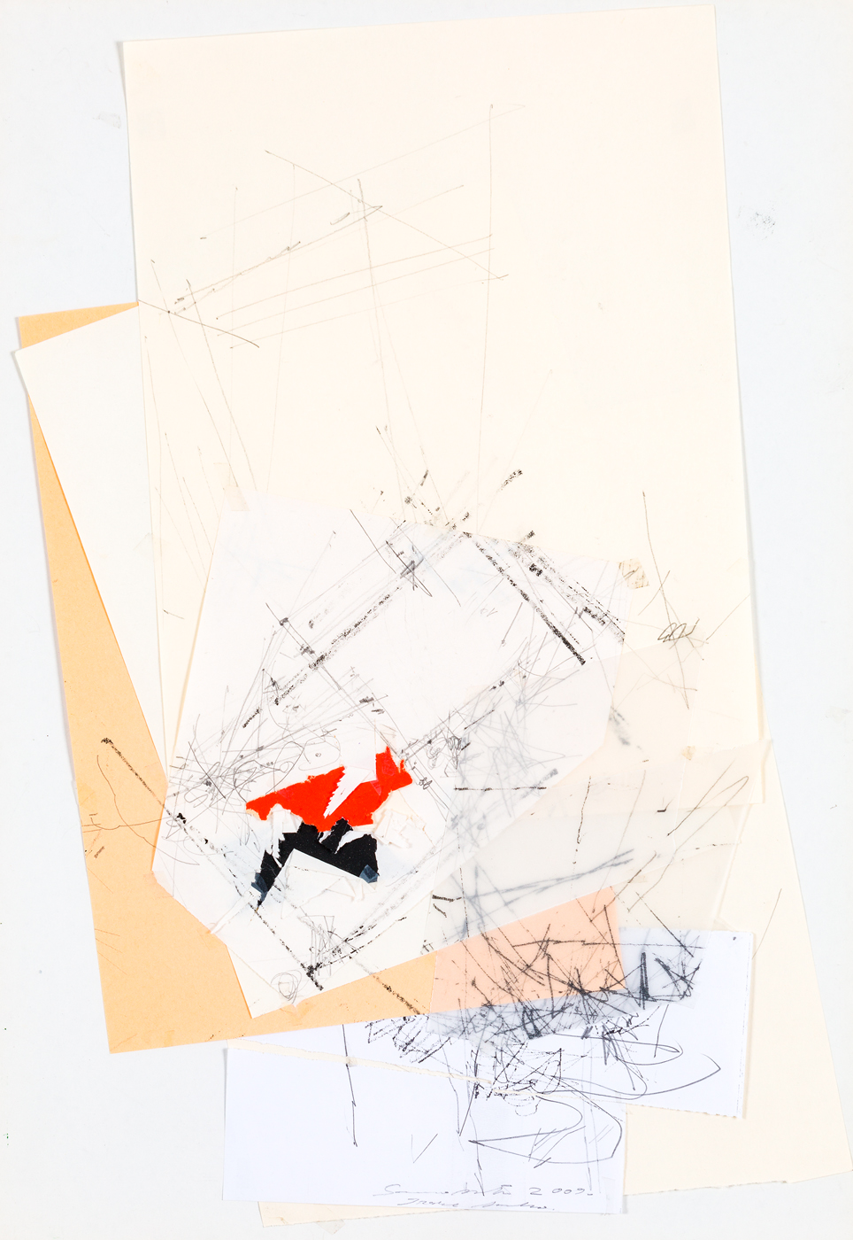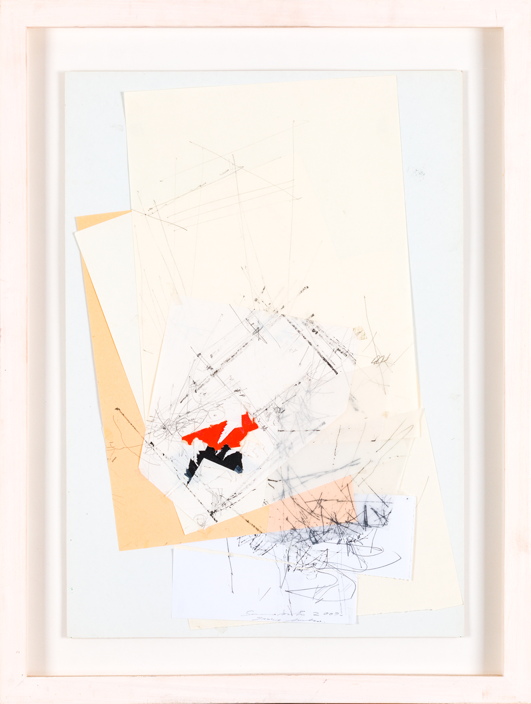Matita e inchiostro su collage di carte applicate su cartoncino