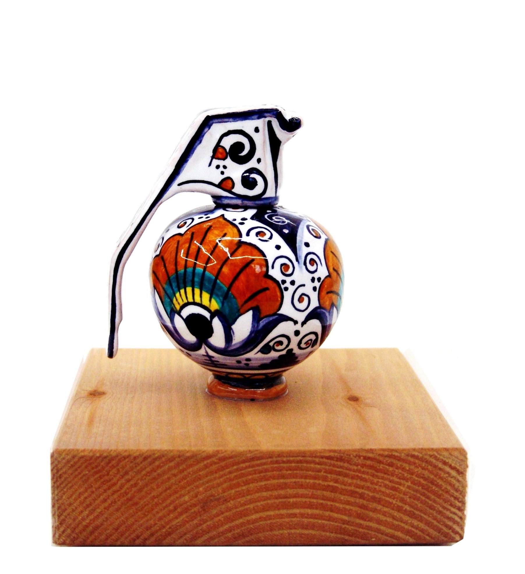 marchio della Bottega Ceramica Gatti di Faenza, opera contenuta in teca di plexiglas