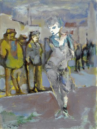 Mino Maccari (Siena, 1898 - Roma, 1989) Gruppo di figure, 1959 Olio su cartone telato, cm. 40x30 Firma e data in basso a sinistra. Autentica su foto Archivio Marco Maccari, n. rep. 4667.