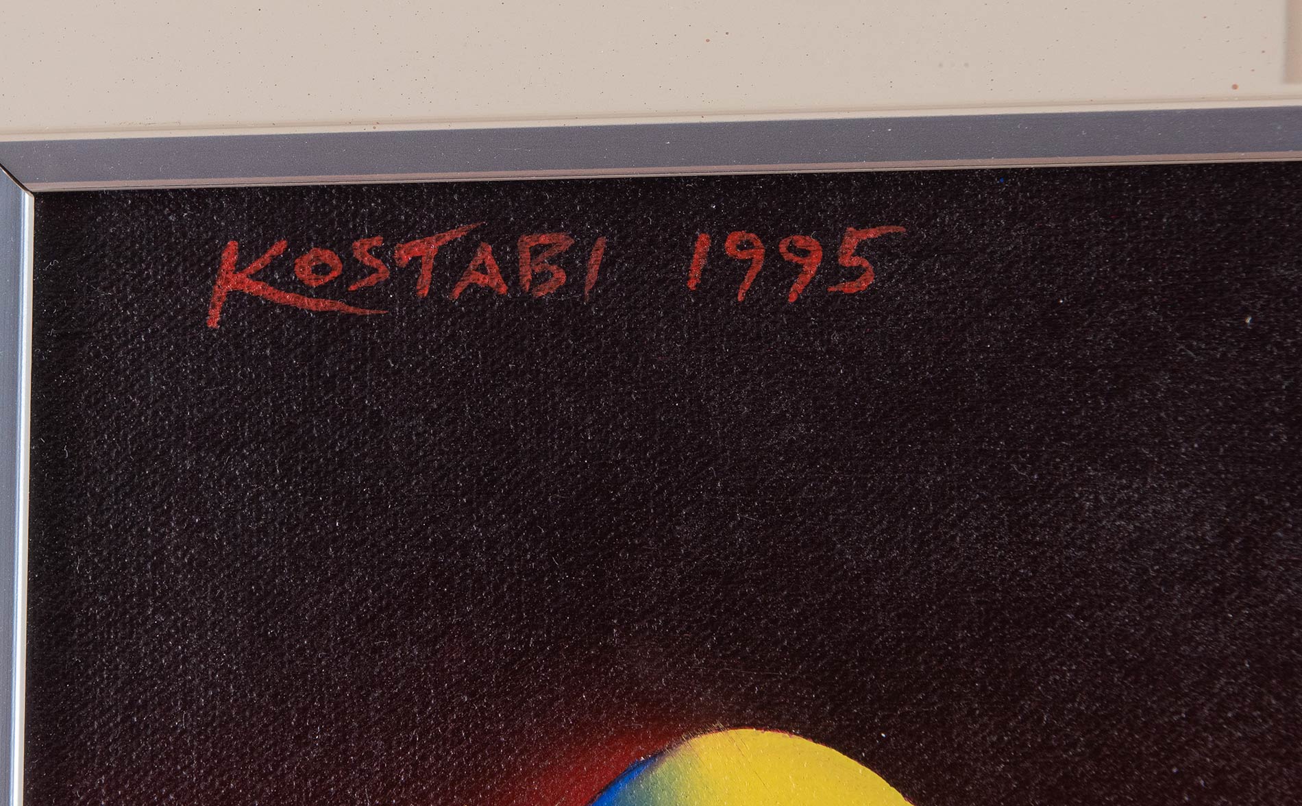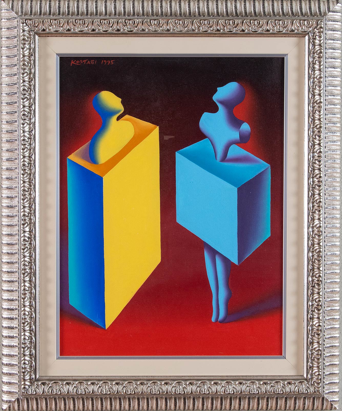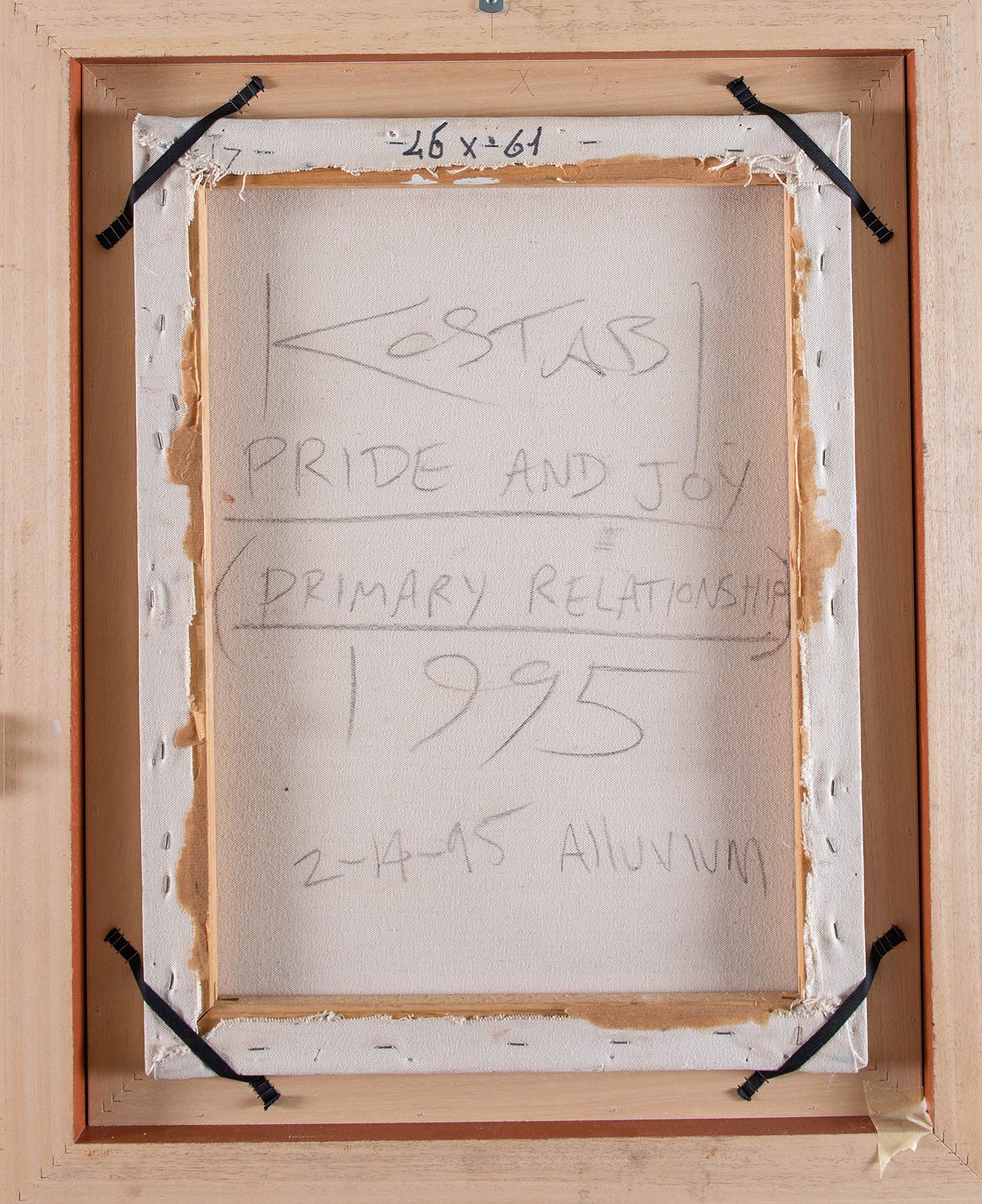 MARK KOSTABI (Los Angeles 1960). 'Pride and joy primary relationship', 1995. Olio su tela. H. Cm 61x46. Opera firmata e datata in alto a sinistra 'Kostabi 1995'. Al retro opera firmata, intitolata e datata 'Kostabi 1995'. Opera accompagnata da autentica su fotografia dell'artista in data 4/09/1996.