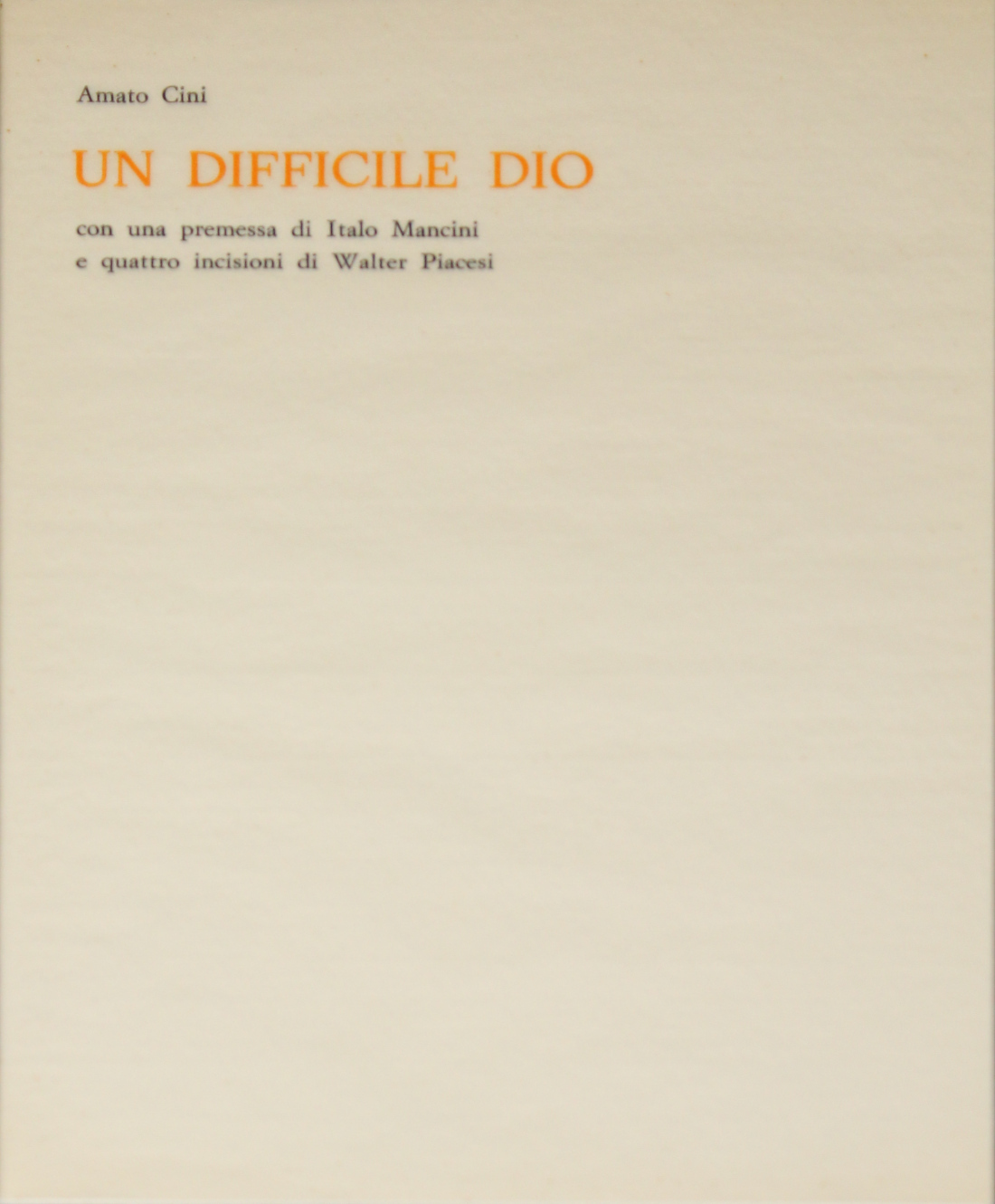 PIACESI WALTER Un difficile Dio, Libro contenente 4 acqueforti di Walter Piacesi di cui sono state tirate 75 copie stampate a cura di Alberto Bernini dalle Arti Grafiche Editoriali Srl per le Edizioni Ca Spinello in Urbino nel mese di gennaio 1977