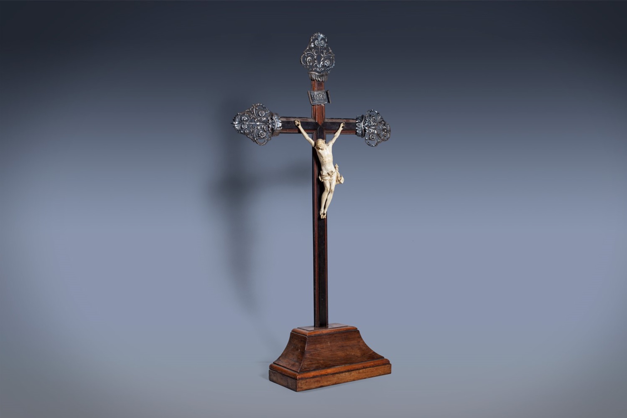 Crocifisso in avorio, su croce in legno, con terminali in argento, secolo XIX