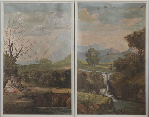 Scuola del secolo XIX "Paesaggio con cascata e figure" e "Figure in un paesaggi