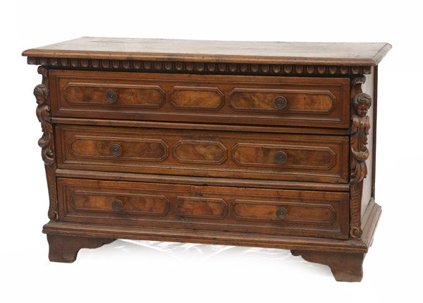 Antico comò in noce a tre cassetti riquadrati e scanallati fascia del primo scolpita a unghiature, montanti intagliate ad erme(cm 128x82x58) (difetti e restauri)