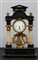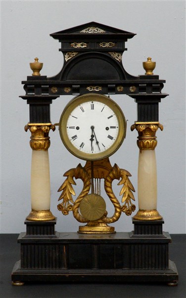 Pendola austriaca da tavolo a portico in legno ebanizzato ed inserti in madreperla con colonnine in alabastro. Quadrante smaltato a numeri romani, carica manuale con suoneria su gong di ore e quarti. Epoca metà sec. XIX (cm 40 x 62 x 13) (difetti)