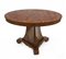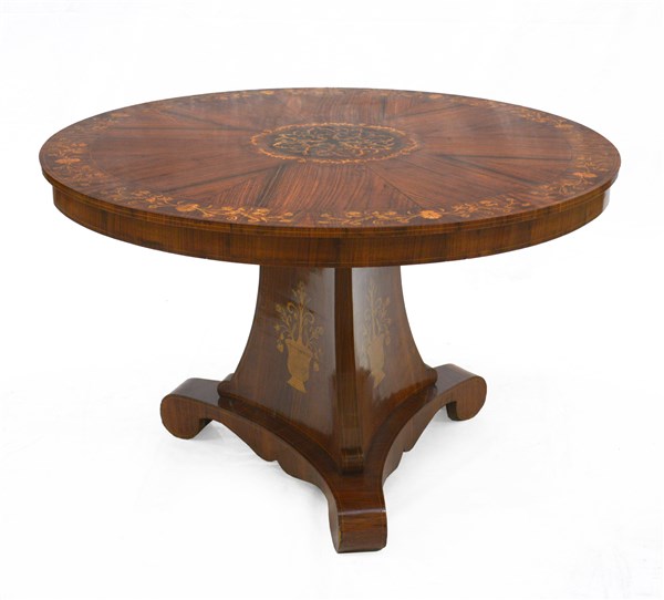 Tavolo da centro con piano circolare lasronato e intarsiato a motivi vegetali e floreali. Sostegno tripode a plinto decorato con vasi di fiori intarsiati. Piedi sagomati (d cm 130, h cm 75) (lievi difetti)