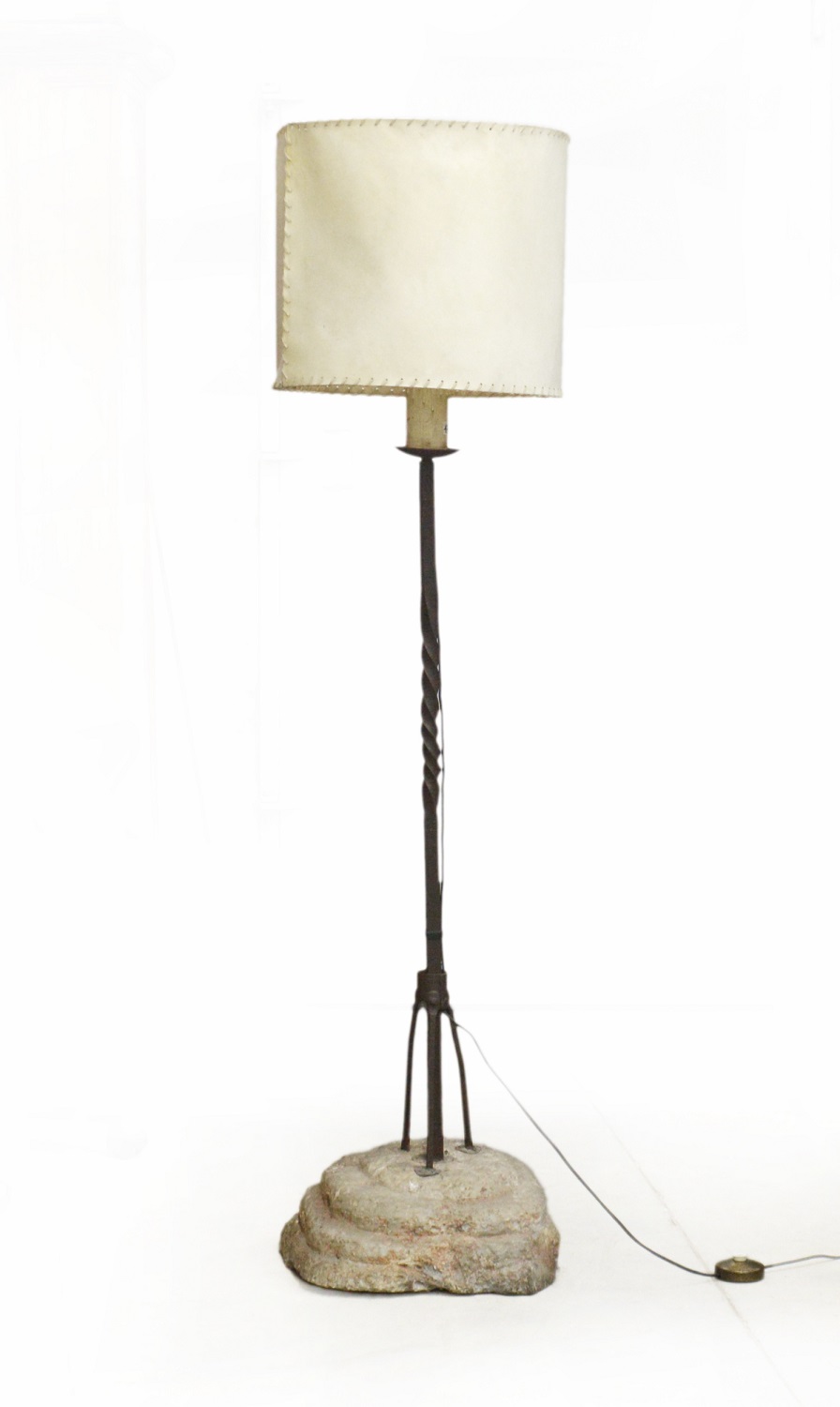 Antico portacero in ferro battuto con base a capitello in pietra (h. cm 125) (d