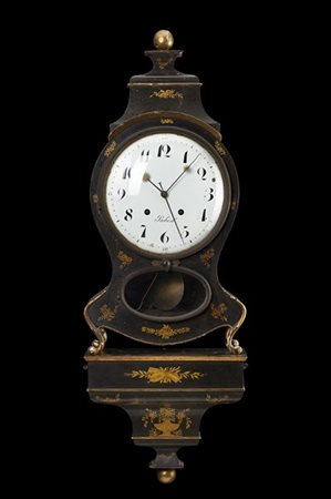 Pendola musicale del tipo "Neuchateloise" su mensola, con cassa in legno laccato con decori floreali.
