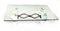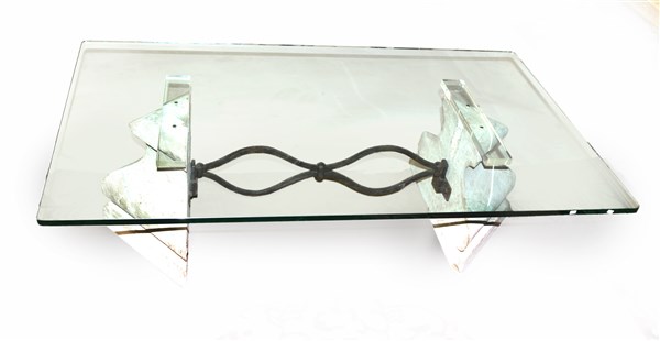 Tavolino da salotto con basi in pietra riunite da traversa in ferro battuto e piano in cristallo (cm 140x42x80) (difetti e mancanze)