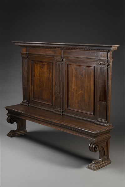 Antica panca da ingresso in noce, gambe intagliate, sagomate a ricciolo, la parte superiore a lesene scanalate. Mobile costruito con elementi antichi (cm 198x168x39) (difetti)
