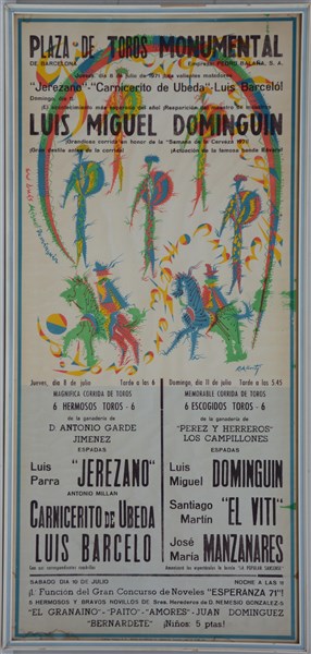 Locandina pubblicitaria spagnola della corrida del 1971, con illustrazione di Rafael Alberti (cm 100x46), in cornice (difetti)